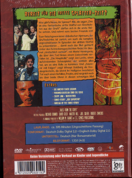 Genau das richtige für jede Halloween-Party. Was gibt‘s Neues, ihr Spinner? Alle, die sagen „Das ist eine fantastische dritte Staffel von Geschichten aus der Gruft“ dürfen sich in die erste Reihe setzen. Und nehmt eure besten Freunde mit! Euer fleischgewordener diabolischer Alptraum, der Gruftwächter, ist zurück, um euch die komplett ungeschnittenen 14 Episoden der dritten Staffel zu präsentieren … damit euch das Blut gefriert! Unter den Schreckensgeschichten findet ihr diesmal „Unsterblich verliebt“, mit Mariel Hemingway, die über den Tod hinaus einem Liebestrank verfallen ist. „Die Hauptrolle“ zeigt Jon Lovitz, einen aufstrebenden Schauspieler, der wirklich alles tut, um an eine Rolle zu kommen. Und „Souvenir mit Folgen“ zeigt Whoopi Goldberg als Voodoopriesterin, die brutal ihr Heiligstes beschützt! Tut euch einen Gefallen, Freaks, und vergrabt euch bis über beide Ohren in diesen schaurigen Mix!