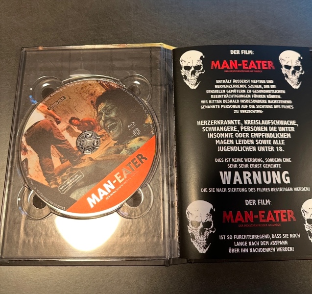 Das Mediabook selbst ist ein echter Hingucker: Mit einem zutiefst beeindruckenden Cover, das die Essenz des Filmes einfängt, verspricht es, ein Schmuckstück in jeder Sammlung zu sein. Neben dem Film beinhaltet das Mediabook exklusive Extras, die tiefer in die Entstehungsgeschichte und das Konzept von "Man-Eater" eintauchen lassen.