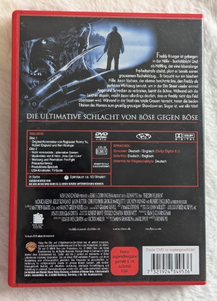 Zögern Sie nicht und holen Sie sich jetzt diese Horror-Klassiker-DVD. Perfekt für einen gruseligen Filmabend oder als wichtiger Bestandteil jeder Horrorfilmsammlung. Lassen Sie sich diese spezielle 2-Disc Edition von "Freddy vs. Jason" nicht entgehen und erleben Sie das ultimative Duell zwischen zwei Titanen des Schreckens!