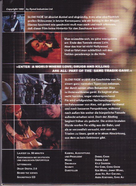 SLOW FADE ist absolut dunkel und abgründig, trotz aller oberflächlich grellen Stilexzesse in letzter Konsequenz wie ein Schlag in den Magen. Ebenso fasziniert wie geschockt muß man nach und nach erkennen, daß dieser Film keine Hintertür für den Zuschauer bereithält.