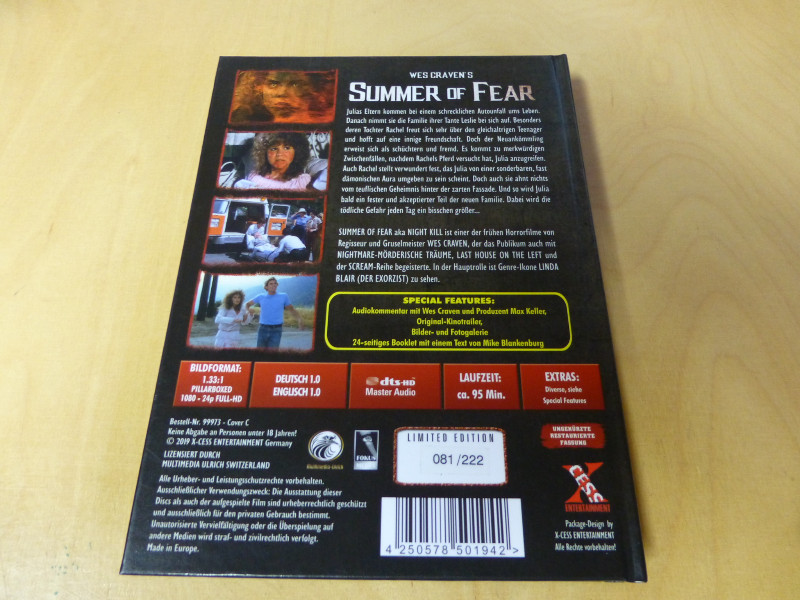 Neben dem Hauptfilm enthält das Mediabook auch zahlreiche Extras, die tiefe Einblicke in die Entstehung des Films geben und somit ein rundum fesselndes Erlebnis bieten. Ob als Geschenk für einen Filmfan oder als Teil Ihrer eigenen Sammlung – "Summer of Fear" garantiert Nervenkitzel und Genuss für anspruchsvolle Liebhaber des Thrillergenres.