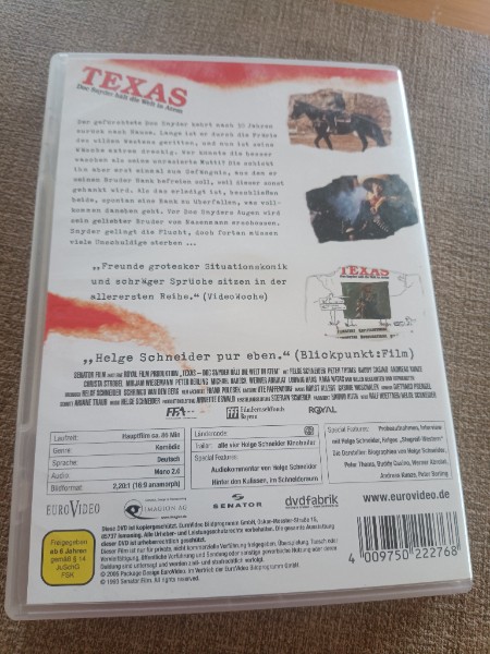 In "Texas - Für eine Handvoll Scheiße", nimmt Helge Schneider die typische Westernfigur auf die Schippe. Der Film erzählt die urkomische und bizarre Geschichte von Doc Snyder, der die Welt, oder zumindest einen kleinen Teil davon, in seinem ganz eigenen, schrägen Stil rettet. Mit einer Kette von skurrilen Ereignissen und unvergesslichen Charakteren liefert dieser Film eine Parodie auf das Westerngenre, die in keiner Sammlung fehlen darf.