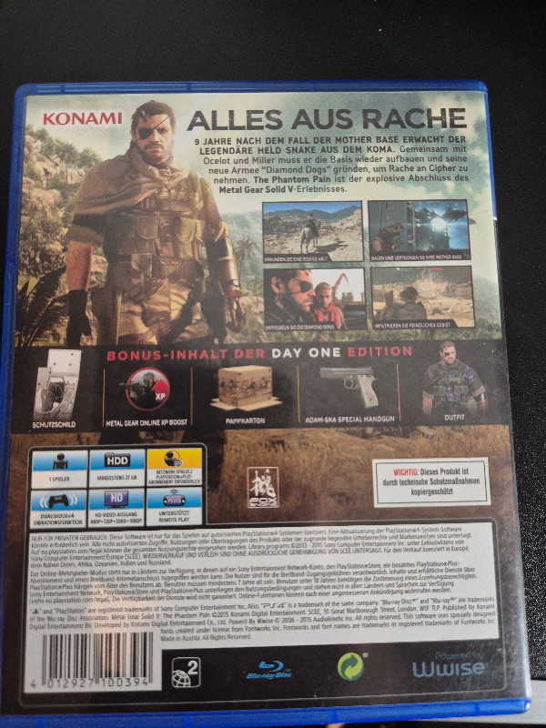Unter der Regie von Hideo Kojima entfaltet sich eine tiefgreifende und dramatische Handlung, in der Sie in die Rolle von Venom Snake schlüpfen. Die Day One Edition enthält zusätzliche Ingame-Inhalte, die das Spielerlebnis vom ersten Moment an erweitern und bereichern. Erleben Sie eine Geschichte von Verrat, Rache und Kampf ums Überleben in einer vom Krieg zerrütteten Welt.