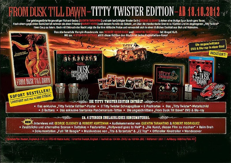Tauchen Sie ein in die aufregende Welt von "From Dusk Till Dawn", eine einzigartige Blu-Ray Edition, die keinen Horror- und Actionfan unberührt lässt. Diese "Titty Twister Edition" ist ein Muss in jeder Sammlung und bietet neben dem hochspannenden Hauptfilm eine Fülle von Special Features, die Sie tief in die Entstehung und das Universum des Films führen.