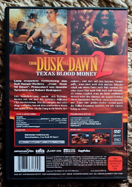 Ob Sie ein langjähriger Fan des ersten Teils sind oder neu in der Welt von "From Dusk Till Dawn", diese DVD ist ein absolutes Muss. Sie bietet spannende Unterhaltung, angereichert mit einer beängstigenden Wendung, die Sie sicher am Rand Ihres Sitzes halten wird. Machen Sie sich bereit für eine Nacht voller Schrecken und Spannung – holen Sie sich jetzt "From Dusk Till Dawn 2: Texas Blood Money" und lassen Sie das Dunkel herein!
