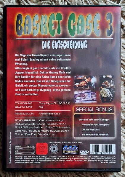 Regie führte der Kultregisseur Frank Henenlotter, bekannt für seine Fähigkeit, Schockelemente gekonnt mit schwarzhumorvollen Twists zu verbinden. In "Basket Case 3" erreicht Henenlotters Talent für bizarr-unterhaltsames Storytelling einen neuen Höhepunkt.