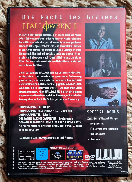 Diese DVD-Ausgabe bietet eine ausgezeichnete Bild- und Soundqualität, die Sie die Spannung und Angst des Originals hautnah erleben lässt. Verpackt in einer ansprechend gestalteten Hülle, die das ikonische Bild von Michael Myers in der Halloween-Nacht zeigt, ist diese DVD nicht nur ein Sammlerstück, sondern auch das perfekte Geschenk für Halloween.