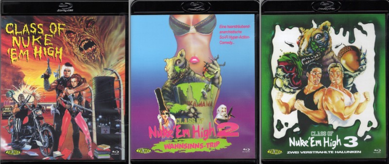 Teil 1 – "CLASS OF NUKE 'EM HIGH" – beginnt die Trilogie mit einem explosiven Auftakt, in dem eine lokale High School durch radioaktiven Müll in einen Brutkessel für Chaos und Gewalt verwandelt wird. Die Kombination aus Sozialkritik und überdrehter Comic-Action macht diesen Film zu einem unvergesslichen Erlebnis.