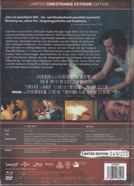 Lassen Sie sich von der exklusiven Limitierung auf nur 222 Exemplare dieses besonderen Mediabooks verzaubern! "Wild at Heart - Mediabook C" ist ein Muss für alle Fans des Kultfilms sowie Sammler edler Filmeditionen. Dieses einzigartige Mediabook enthält den renommierten Film von David Lynch, in dem Nicolas Cage und Laura Dern in den Hauptrollen brillieren. Das Cover des Mediabooks besticht durch ein atemberaubendes Design mit einem herzförmigen Motiv, das von einem Dolch durchbohrt wird - ein echter Blickfang in jeder Sammlung!