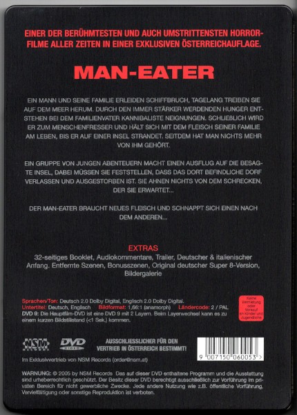 Tauchen Sie ein in die Abgründe menschlicher Furcht und Spannung mit dem Steelbook der "MAN-EATER (Der Menschenfresser)" 2-DVD-Box von NSM, die in eine ungeschnittene Version, exklusiv für Horrorfilm-Liebhaber und Sammler.