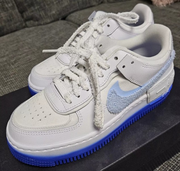 biete ein Paar schöne weiß/blaue Sneaker von Nike in der Größe EU 36,5 an. Modell Air Force 1 Shadow.