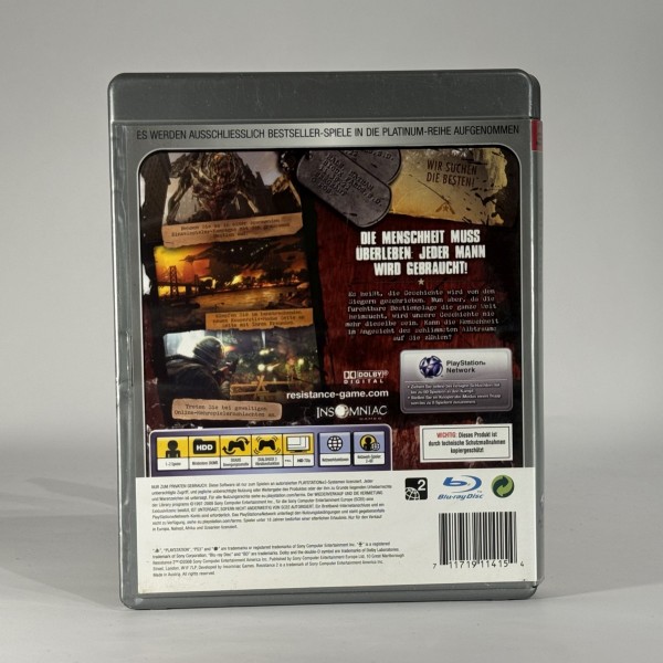 Diese besondere Platinum Edition von Resistance 2 befindet sich in einem Zustand wie neu. Mit der Originalverpackung, die keinerlei Gebrauchsspuren aufweist, sichert dieser Kauf ein fast unberührtes Spielerlebnis. Das USK 18 Rating gewährleistet zudem, dass der Inhalt erwachsenengerechte Unterhaltung bietet.