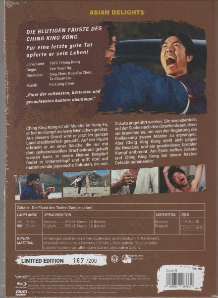 Erleben Sie mit dem limitierten Mediabook von "Zakato - Die Faust des Todes" ein Meisterwerk des Hongkong-Kinos aus dem Jahr 1973, aufwendig restauriert in brillanter Bildqualität. Dieses exklusive Sammlerstück ist auf nur 200 Exemplare weltweit limitiert, von denen jedes sorgfältig nummeriert wurde, um seine Einzigartigkeit zu garantieren – Sie erhalten hier die Nummer 167.