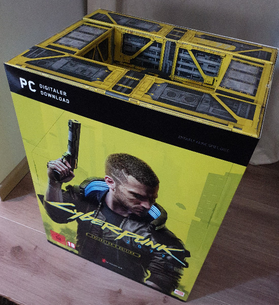 Die Collector's Edition von Cyberpunk 2077 kommt in einer beeindruckenden, thematisch gestalteten Box, die direkt das Gefühl des Spiels einfängt. Die Verpackung zeigt eindrucksvolle Grafiken mit dem Protagonisten des Spiels und ist ein echter Hingucker. Als Highlight beinhaltet diese Edition aufregende physische und digitale Zusatzinhalte, die Sie tiefer in das Universum von Cyberpunk eintauchen lassen.