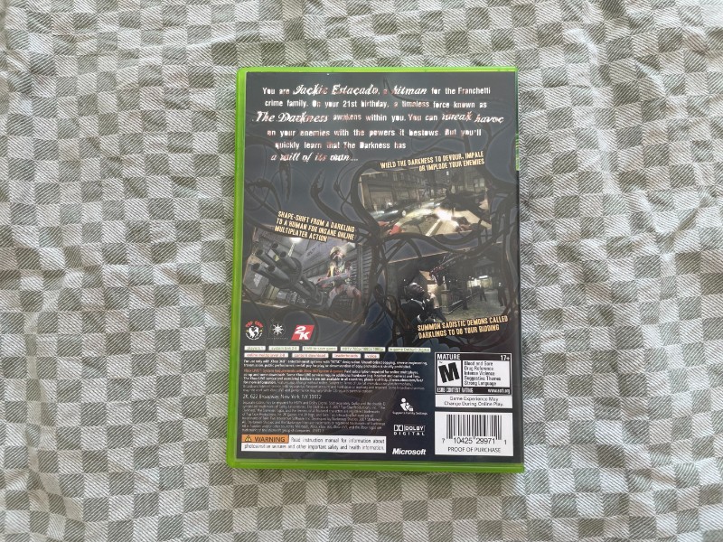 "The Darkness" bietet eine fesselnde Storyline, die auf der gleichnamigen Comic-Serie von Top Cow Productions basiert. Die düstere und atmosphärische Grafik expandiert die emotionale Erzählweise, während der Spieler durch düstere Straßen und geheimnisvolle Orte streift. Das Spiel unterstützt auch Xbox Live, was Multiplayer-Herausforderungen und weitere Download-Inhalte ermöglicht.