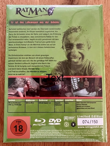 Das Mediabook kommt in einer hochwertigen Verpackung und bietet neben dem Film zusätzliche Bonusmaterialien, die tiefere Einblicke in die Entstehung des Films geben. Dieses Sammlerstück ist ideal für alle, die eine Vorliebe für exklusive Filmreleases haben und Wert auf besondere Editionen legen. Sichern Sie sich Ihr Exemplar von "Ratman" in der limitierten Cover C-Version und erleben Sie Heimkino mit einem Hauch von Exklusivität und Nervenkitzel.
