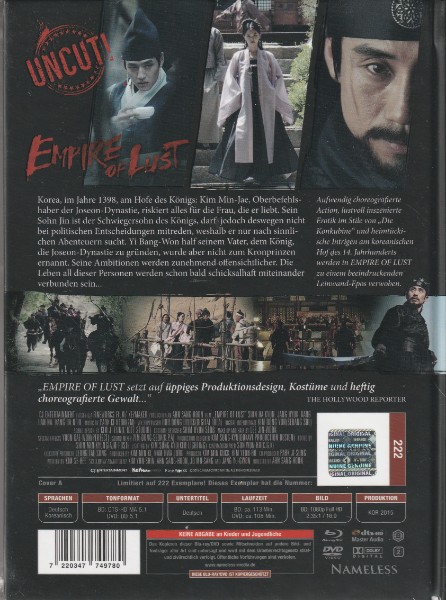 Tauchen Sie ein in die faszinierende Welt des koreanischen Kinos mit dem beeindruckenden Film "Empire of Lust". Dieses Mediabook enthält nicht nur die Blu-ray, sondern auch die DVD-Version des Films und bietet somit maximale Flexibilität beim Anschauen. "Empire of Lust" ist ein actiongeladener Film, der Sie mit auf eine Reise durch eine blutgetränkte Geschichte hinter dem Thron nimmt. Erleben Sie atemberaubende Kampfszenen, tiefgründige Charakterentwicklungen und eine packende Story, die Sie nicht mehr loslassen wird.