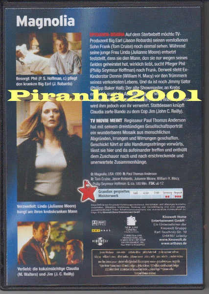 Sowohl für Fans von tiefgehenden Dramen als auch für Anhänger der beteiligten Schauspieler ist "Magnolia" eine wertvolle Bereicherung der eigenen DVD-Bibliothek. Erleben Sie komplexe Charakterzeichnungen und eine fesselnde Geschichte, die Sie nicht so schnell vergessen werden. Gönnen Sie sich diese einzigartige DVD-Edition und vertiefen Sie sich in eine der eindrucksvollsten filmischen Darstellungen menschlicher Emotionen und Beziehungen.