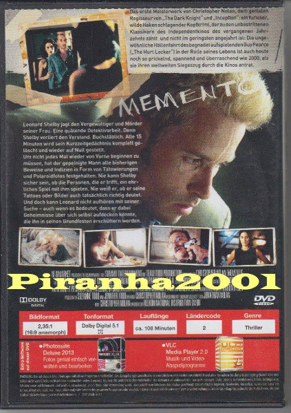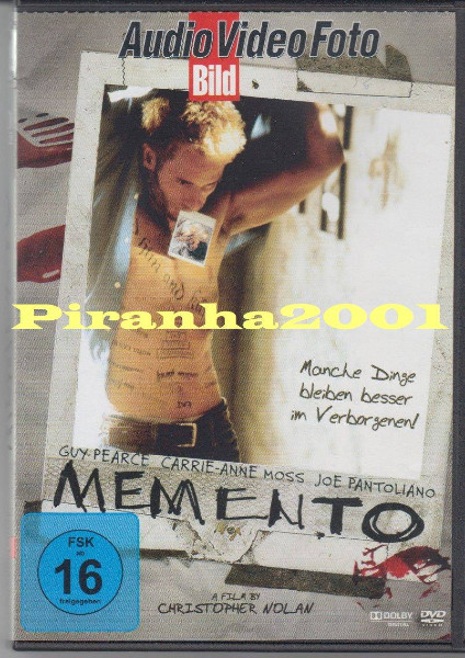 Die DVD ist in Originalverpackung (OVP) und enthält exklusive Einblicke in die Entstehung des Films. Mitkostenlosem Dolby-Digital-Sound, welcher das Erlebnis noch intensiver und realistischer macht. Tragen Sie dazu bei, dass „Memento“ nicht nur ein Film, sondern ein audiovisuelles Erlebnis wird, das Sie nicht mehr loslässt.