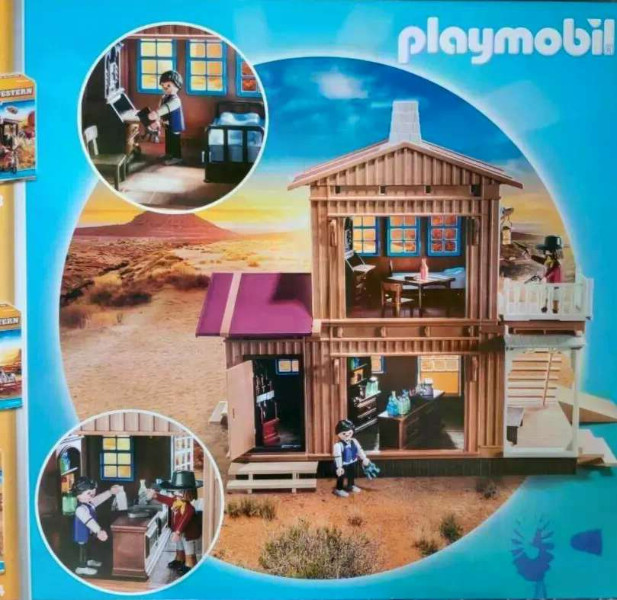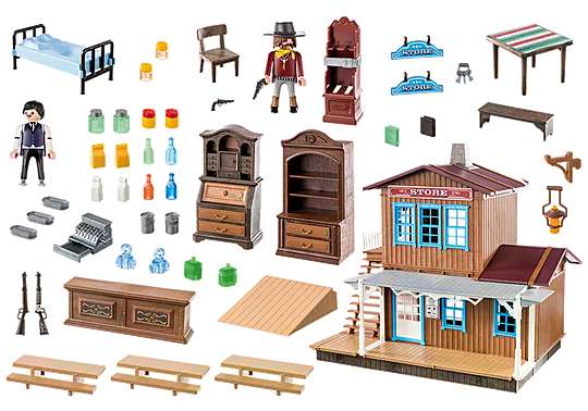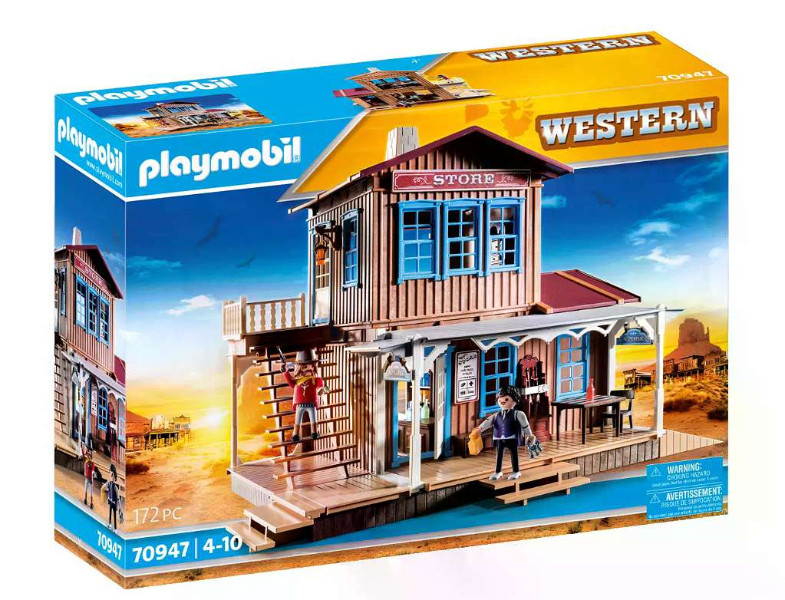 Zu den Highlights zählen realistisch nachgebildete Details wie Holzfassaden, ein Schild mit der Aufschrift "Store" und verschiedene Accessoires, die das Western-Motiv unterstreichen. Das Set bietet nicht nur Kindern im Alter von 4 bis 10 Jahren eine ideale Plattform für imaginative Geschichten und Spiele, sondern ist auch ein Muss für Sammler von nostalgischen Playmobil-Sets.