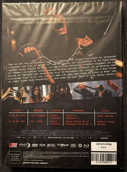 „Martyrs“, bekannt für seine tiefgreifende Story und seine verstörenden visuellen Effekte, fordert den Zuschauer heraus und bleibt dabei faszinierend. Diese Edition beinhaltet nicht nur den Film in seiner ungeschnittenen Form, sondern bietet auch einzigartige Extras, die tiefer in die Entstehung und Bedeutung des Films eintauchen lassen. Verpackt in einem künstlerisch gestalteten Cover, welches die Essenz des Films einfängt, macht diese Edition auch optisch viel her.