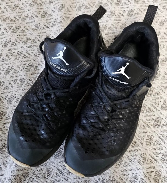 ein Paar schwarze Basketballschuhe von Nike in der Größe EU 43 an. Modell Jordan Extra Fly.