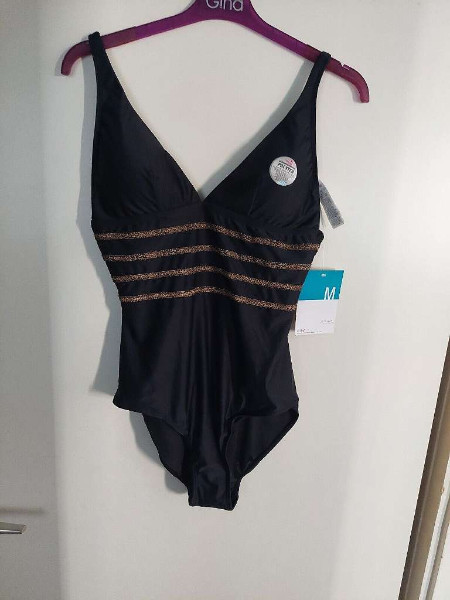 Tauchen Sie ein in den Sommer mit diesem stilvollen Damen Badeanzug in klassischem Schwarz, versehen mit geschmackvollen, goldfarbenen Zierstreifen, die dem Design einen Hauch von Raffinesse verleihen. Perfekt für jede Frau, die Wert auf Eleganz und Komfort am Strand oder im Pool legt. Dieser Badeanzug der Größe M passt ideal für Konfektionsgrößen 40-42. Mit seinem tiefen V-Ausschnitt betont er elegant das Dekolleté, während das hochwertige Material einen optimalen Tragekomfort und eine perfekte Passform bietet. Der Badeanzug ist neu und trägt noch das Original-Etikett, was seine Ungetragenheit und makellose Qualität bestätigt. Ein Must-Have für diesen Sommer!