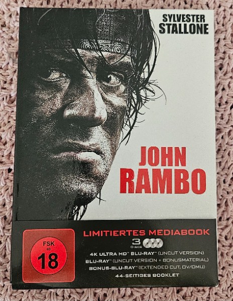 biete den Film "John Rambo" auf 4K UHD Blu Ray und 2D Blu Ray im 3-Disc Mediabook an. Uncut und inklusive Austauschdisk.
