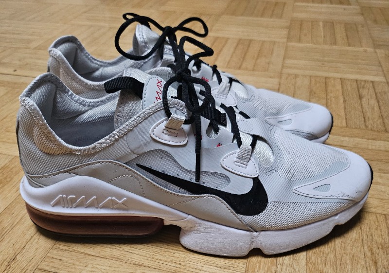 ein Paar weiße Nike Sportschuhe in der Größe EU 44,5 an. Air Max.