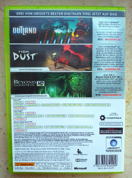 Mit Spielen, die sowohl kritisch gelobt als auch genredefinierend waren, bietet dieses Triple Pack eine wunderbare Möglichkeit, drei außergewöhnliche Spiele zu einem großartigen Preis zu genießen. Ob Sie nun in die mystische Welt von Outland eintauchen, Ihre kreativen Fähigkeiten in From Dust testen oder sich in das Abenteuer von Beyond Good & Evil HD stürzen, dieses Paket bietet Unterhaltung und Herausforderungen für jeden Geschmack.