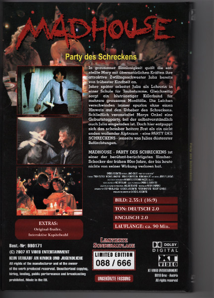 Erleben Sie den Nervenkitzel und das Grauen in dieser „Uncut Limited Edition“ von „Madhouse - Party des Schreckens“. Diese seltene Sammleredition ist ein Muss für Fans von Horror und Splatter-Filmen und bringt die düstere Atmosphäre des Films eindrucksvoll auf DVD.