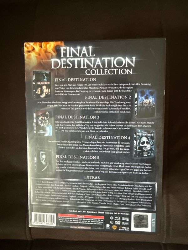 Die Box ist für Zuschauer ab 18 Jahren freigegeben und hält sich konsequent an die Altersfreigabe, indem sie die Intensität und die Schrecken der Final Destination-Reihe ungeschmälert präsentiert. Von bizarren Unfällen bis hin zu schockierenden Wendungen – diese Sammlung bietet alles, was das Horror-Herz begehrt. Perfekt für einen gruseligen Filmabend oder als wertvolles Geschenk für den Filmfanatiker in Ihrem Leben.