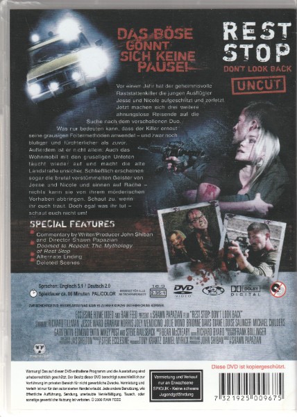 Lassen Sie sich dieses Stück Filmgeschichte nicht entgehen und holen Sie sich "Rest Stop 2: Don't Look Back" in der ungeschnittenen und unzensierten Fassung, um voll und ganz in die erschreckende Atmosphäre, die Sie von einem echten Splatter erwarten, einzutauchen. Vervollständigen Sie Ihre Sammlung mit diesem Meilenstein des Horrorfilms und erleben Sie ein Kinoerlebnis, das Sie garantiert am Rand Ihres Sitzes hält. Treten Sie in die dunkle Welt von Rest Stop ein, aber denken Sie daran: Don't Look Back.