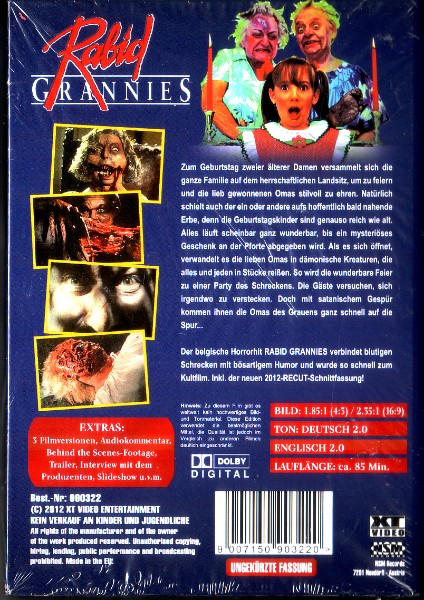 Erforschen Sie die erschreckenden Tiefen der Horror-Unterhaltung mit der "Rabid Grannies - 2 Disc Uncut Edition XT". Dieses packende Horrorfilm-Set präsentiert eine außergewöhnliche Version eines schockierenden und grotesken Films, der Sie sicherlich an den Bildschirm fesseln wird.