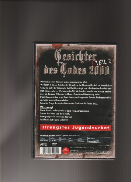 Tauche ein in die Abgründe der menschlichen Psyche mit der "Gesichter des Todes 2000 - Teil 2 UNCUT DVD", eine unvergleichliche Dokumentation des Grauens, die deine Vorstellungskraft herausfordern und möglicherweise überschreiten wird. Diese UNCUT-Special-Edition ist ein Muss für jeden Liebhaber des Splatter-Genres und bietet dir eine unrasierte, ungeschönte Sicht auf die dunkelsten Aspekte der menschlichen Existenz.