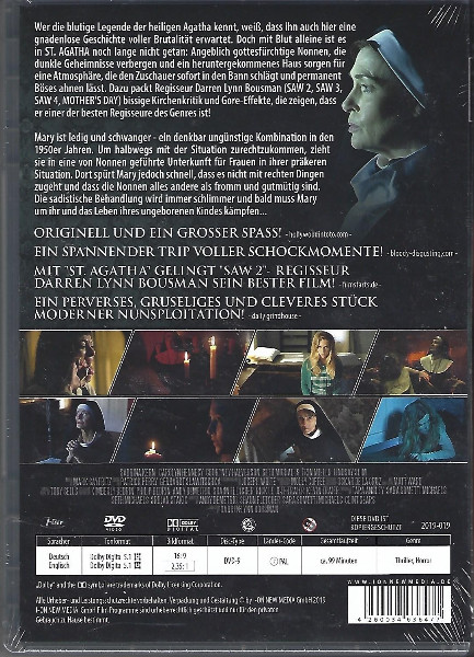 St. Agatha (FSK 18) ist eine DVD, die in keiner Horror-Sammlung fehlen sollte. Die Kombination aus exzellenter Regie, beeindruckender schauspielerischer Leistung und einer Story, die unter die Haut geht, macht diesen Film zu einem unvergesslichen Erlebnis.