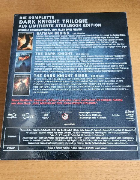 Biete das limitierte 5-Disc-Steelbook-Set der Nolan-Trilogie („Batman Begins“, „The Dark Knight“, „The Dark Knight Rises“). Reine Blu-ray-Edition (kein 4K).