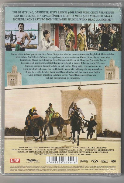 "Der Gauner von Bagdad" zeichnet sich durch seine actionreiche Handlung und die faszinierenden Kulissen, die das historische Bagdad zum Leben erwecken, aus. Mit Steve Reeves in der Hauptrolle erlebst du kinoreife Momente voller Spannung und Nervenkitzel. Die lebhaften Farben und die detailreiche Gestaltung des Covers sind ein Vorgeschmack auf das visuelle Spektakel, das dich erwartet.