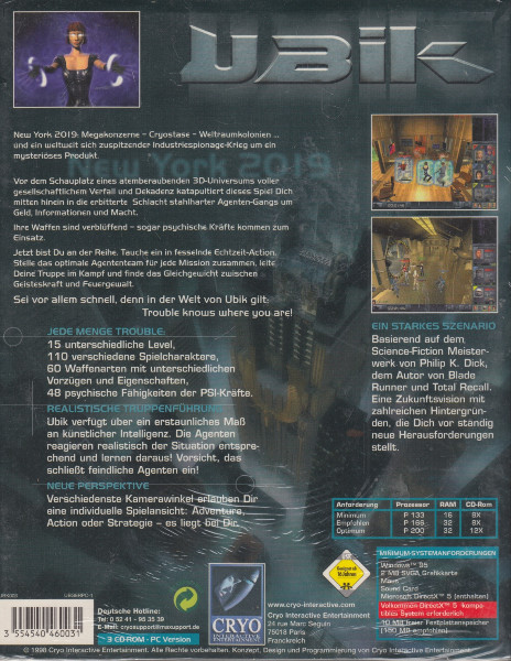 Wenn Du ein Fan von Science-Fiction, klassischen PC-Spielen oder ein Bewunderer von Philip K. Dick bist, darf "UBIK - CRYO 3 CD-Rom PC Windows 95 - Big Box Neu" nicht in Deiner Sammlung fehlen. Sicher Dir jetzt diese seltene Ausgabe in perfektem Zustand und erlebe ein unvergleichliches Abenteuer in der Welt der PC-Spiele!