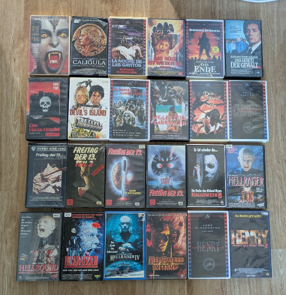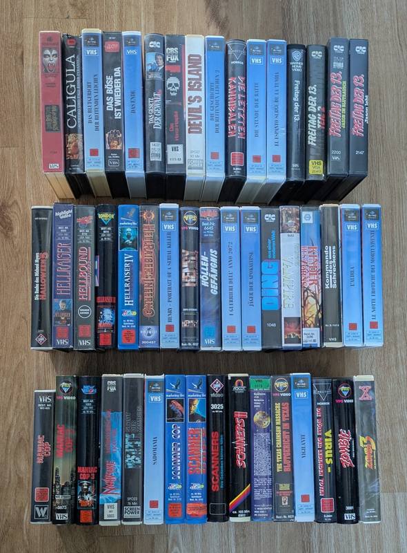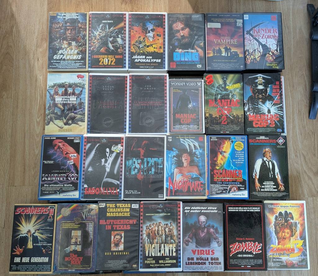 Zum Verkauf steht eine umfangreiche Sammlung von 49 VHS-Kassetten aus den Bereichen Horror, Splatter, Kannibalenfilm, Zombiefilm und Kultkino.