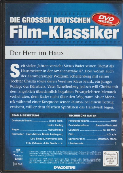Diese exklusive DVD ist Teil der renommierten Serie "Die Großen Deutschen Film-Klassiker", wobei "Der Herr im Haus" stolz die Nummer 19 ziert. Dies macht die DVD nicht nur zu einem optimalen Sammlerstück für Liebhaber deutscher Kino-Kultur, sondern auch zu einer perfekten Ergänzung für jede Film-Bibliothek.
