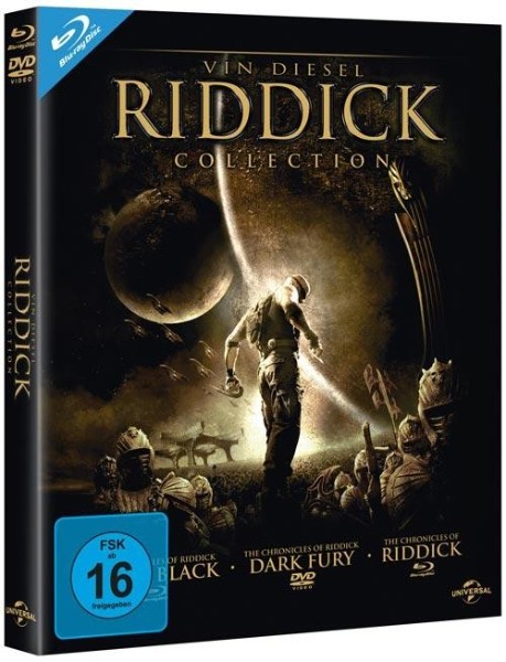 Pitch Black Auf einem entlegenen Planeten muss die Pilotin Fry (Radha Mitchell) mit ihrem Raumschiff zu einer Notlandung mit katastrophalen Folgen ansetzen. Zu den Überlebenden des Absturzes gehört unter anderem der extrem gefährliche Killer Riddick (Vin Diesel), der eigentlich in ein Gefängnis überführt werden soll. Auf dem glühend heißen Planeten treffen die Gestrandeten bei ihrer Suche nach Wasser auf eine verlassene Forschungsstation. Sie entdecken, dass eine Sonnenfinsternis bevorsteht, und als die Dunkelheit hereinbricht, kommen die wahren, schrecklichen Herrscher des Planeten zum Vorschein. Die Überlebenden haben nur eine Chance - dem knallharten Killer Riddick zu vertrauen... Riddick Krieger der Finsternis Als er von Kopfgeldjägern geschnappt wird, muss Riddick gegen fast unbesiegbare Kopfgeldjäger und bösartige Kreaturen kämpfen. Nur Riddicks Fähigkeit, in der Dunkelheit zu sehen, und sein unbarmherziger Kampfstil stehen zwischen der Freiheit und einem Schicksal, das schlimmer ist als der Tod