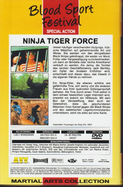 Der Film, verpackt in einer auffälligen gelben Hartbox, zeigt auf dem Cover dynamische Szenen aus den filmischen Highlights. Zu sehen sind beeindruckende Darstellungen der Hauptcharaktere, die sich in intensiven Kämpfen und dramatischen Situationen behaupten müssen. Diese besondere Verpackungsart macht "Ninja Tiger Force" auch zu einem idealen Geschenk für alle, die das Flair von klassischen Actionfilmen und die Kunst der Kampfsportfilme schätzen.