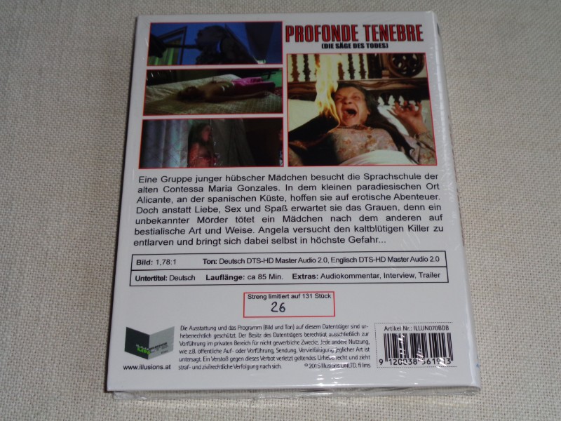 Tauchen Sie ein in die düstere Welt des Horrorkinos mit der exklusiven Blu-Ray "Die Säge des Todes" (Profonde Tenebre), angeboten in der limitierten kleinen Hartbox. Diese hochwertige Blu-Ray ist genau das Richtige für alle Film- und Horrorfans, die ein echtes Sammlerstück ihr Eigen nennen möchten. Die Originalverpackung (OVP) garantiert Ihnen ein nagelneues Produkt, das optimal auf Ihre Heimkinosammlung abgestimmt ist.