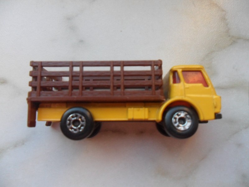 Tauchen Sie ein in die Welt der Nostalgie mit dem exquisiten Matchbox LKW Cattle Truck, einem perfekten Stück für Sammler und Liebhaber von Miniatur-Modellautos. Dieser sorgfältig gestaltete Lastwagen spiegelt die klassische Handwerkskunst wider, für die Matchbox bekannt ist. Der gelb-braune Farbton des Fahrzeugs zusammen mit den deutlich sichtbaren Strukturen des Ladebereichs verleiht ihm ein authentisches und robustes Aussehen.
