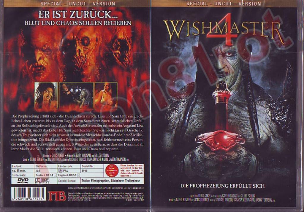 Im vierten Teil der spannenden "Wishmaster"-Reihe erwartet Sie eine ungekürzte, spezielle Version, die keine Wünsche offenlässt. Die Geschichte dreht sich um Lisa und Sam, deren glückliches Leben durch einen schrecklichen Unfall erschüttert wird. Lisa findet plötzlich eine alte Statue und entfesselt damit den mächtigen Dijan, dessen einziger Wunsch es ist, die Menschheit ins Verderben zu stürzen.