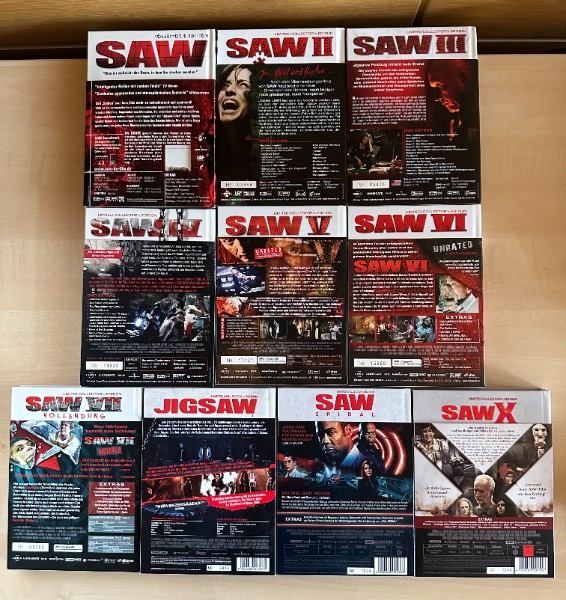 Beinhaltet: Alle bisherigen 10 Teile der Saw-Reihe in ihren Erstauflagen Mediabook-Editionen inkl. den Halbschubern mit den Filminfos und Limitierungsnummern, soweit vorhanden. Die Halbschuber haben zum Teil minimale Lager- bzw. Gebrauchsspuren.
