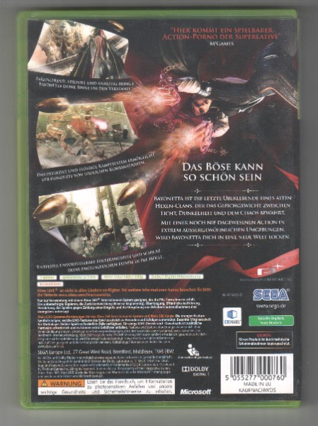 Zögere nicht länger und erlebe Bayonettas Kampf gegen dunkle Mächte und epische Bosse. Hol dir dein Exemplar von BAYONETTA für die Xbox 360 heute noch und stell dich dem Abenteuer, das dich fesseln wird, bis du jede Herausforderung gemeistert hast. Dein nächstes großes Spielabenteuer wartet auf dich!