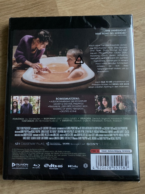 Die Blu-ray-Ausgabe kommt mit einer Vielzahl von Special-Features, darunter exklusive Einblicke hinter die Kulissen, Interviews mit Cast und Crew, sowie gelöschte Szenen, die tiefer in das dunkle Universum von „Bring her Back“ führen. Rated FSK 18, ist dieser Film sicher nichts für schwache Nerven, aber perfekt für Fans des intensiven Kinos.