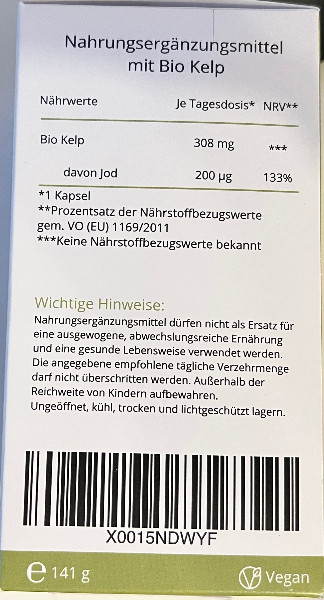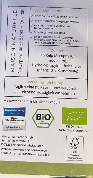 Erleben Sie die pure Kraft der Natur mit den MAISON NATURELLE® Kelp Kapseln. Diese hochwertigen Jod-Kapseln, aus 100% bio-zertifizierten Seealgen (Kelp) gewonnen, bieten Ihnen einen Jahresvorrat von 365 Kapseln. Entwickelt unter höchsten Qualitätsstandards, sind diese Kapseln frei von unerwünschten Zusatzstoffen und geben Ihnen die notwendige Versorgung mit Jod, das für eine gesunde Schilddrüsenfunktion unverzichtbar ist.